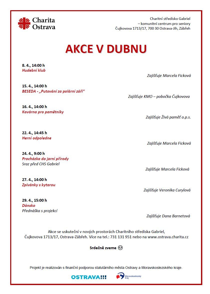 V Charitním středisku Gabriel - komunitním centru pro seniory provozovaném Charitou Ostrava v Ostravě-Zábřehu na Čujkovově ul. č. 1713/17 se můžete zúčastnit těchto akcí a pravidelných aktivit:
