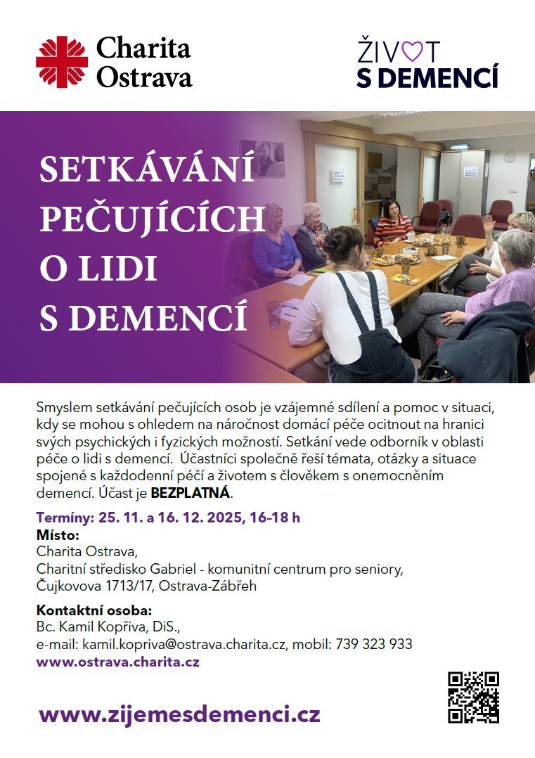 Člověk pečující v domácím prostředí o svého blízkého, který trpí onemocněním demencí, se může ocitnout na hranici svých psychických i fyzických možností. Pomocí může být sdílení náročnosti domácí péče s dalšími lidmi, kteří jsou v obdobné situaci. Srdečně Vás zveme na bezplatná Setkávání pečujících o lidi s demencí, která povede odborník v oblasti péče o lidi s demencí. Účastníci setkání společně řeší témata, otázky a situace spojené s každodenní péčí a životem s člověkem s onemocněním.
